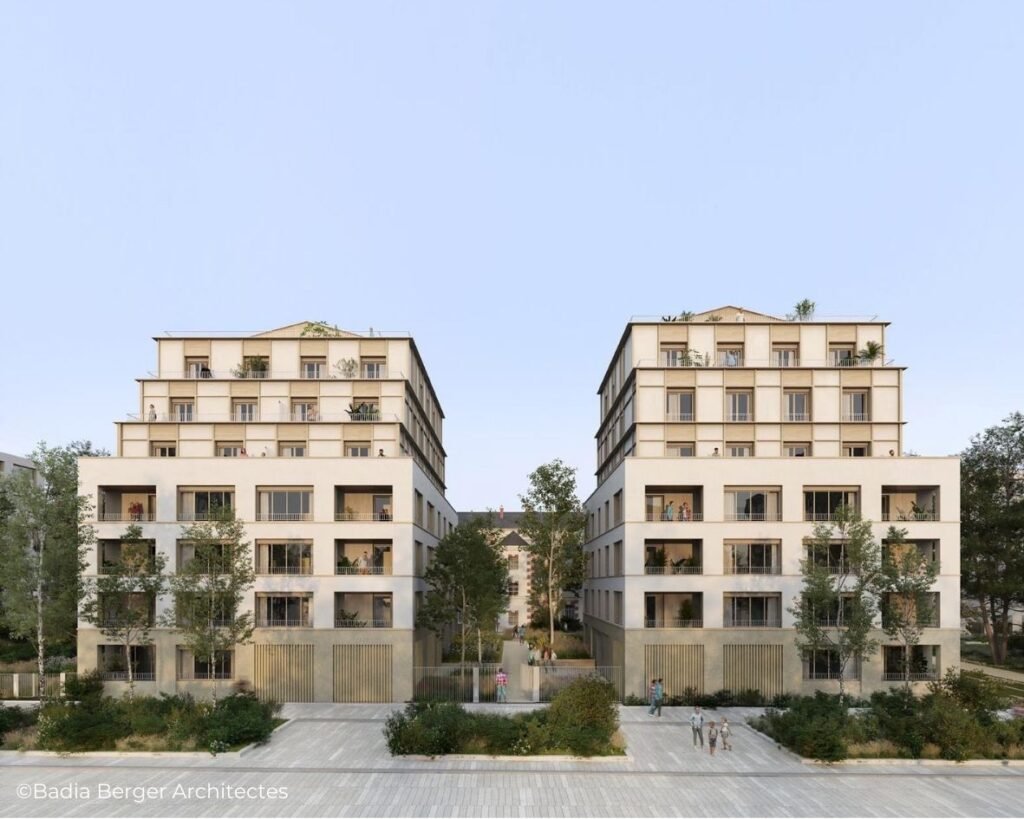 Construction d’un immeuble sur le « hameau Mellinet », 54 logements E3C2 Label biosourcé niveau 3. La résidence est prévue en murs en ossature et en structure bois dans les étages élevés, ce qui permet un faible impact carbone.